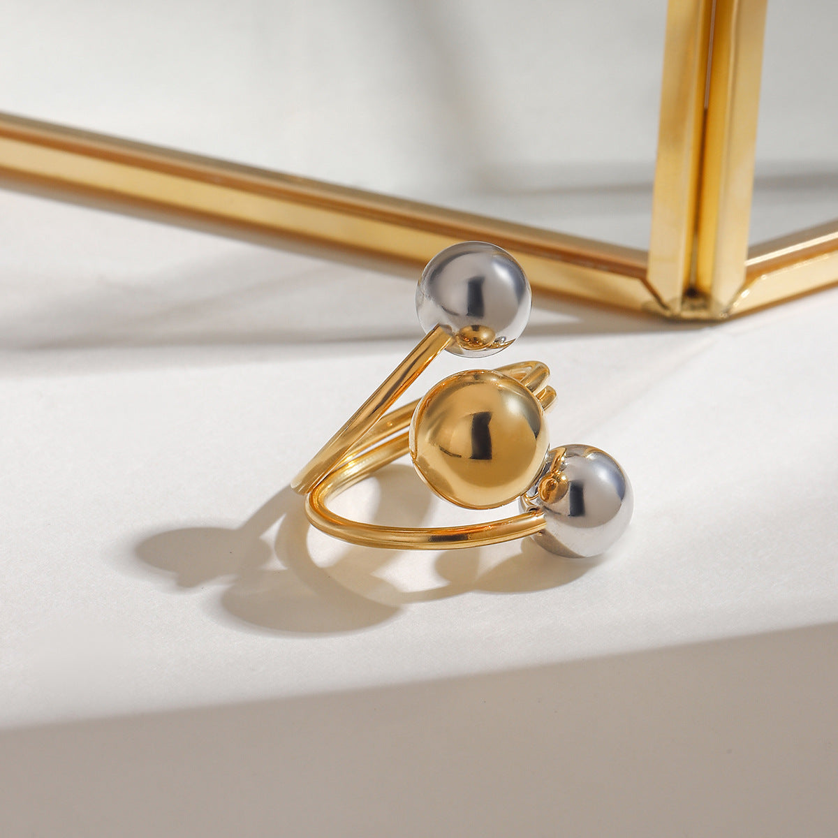 Avec son design double anneau et ses trois sphères dorées et argentées, ce bijou attire immédiatement le regard. Sa composition en acier inoxydable offre un éclat contemporain et une touche futuriste, idéale pour sublimer une tenue sobre.
