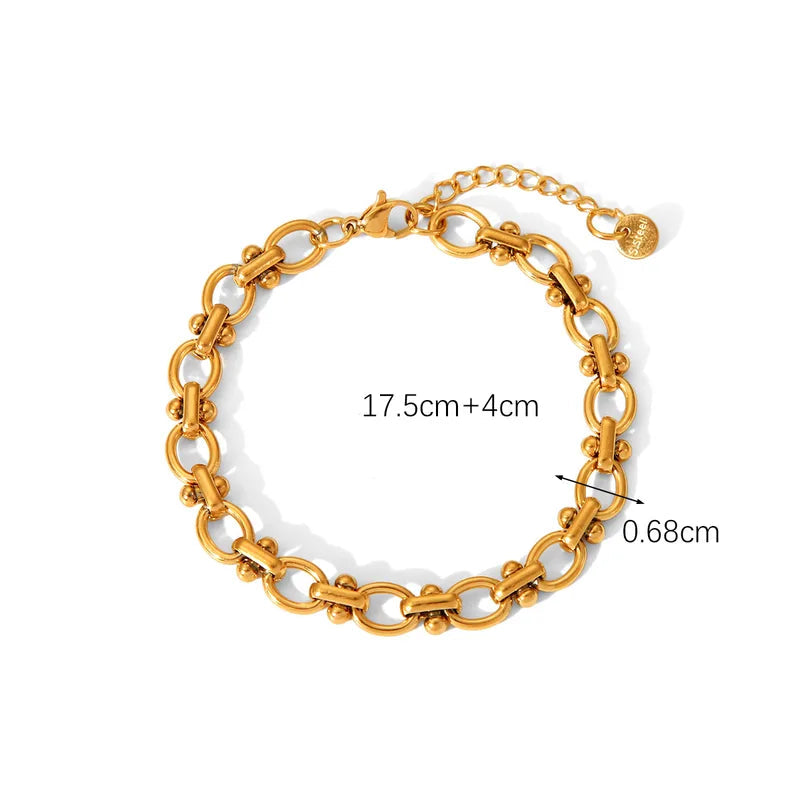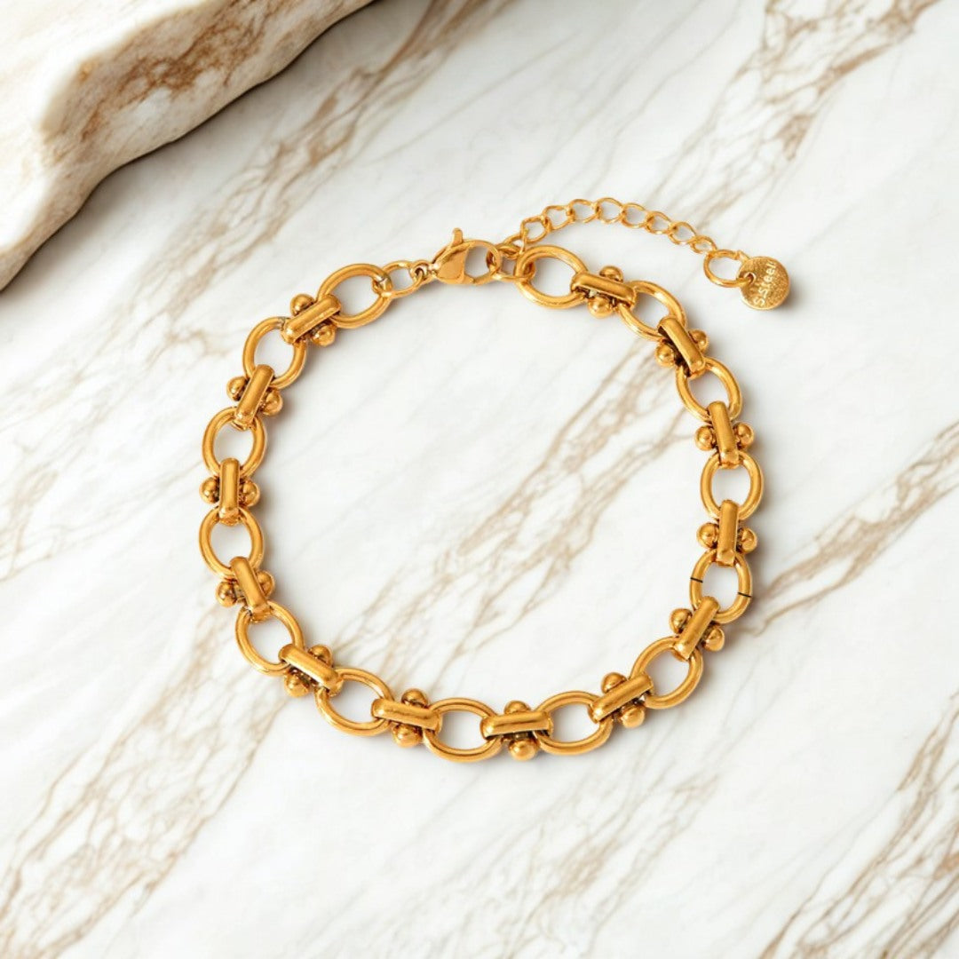 Le bracelet Orbe se distingue par son enchaînement de maillons ronds et de détails dorés. Sa structure rythmée apporte un équilibre entre élégance moderne et caractère, parfait pour sublimer vos tenues du quotidien ou de soirée.