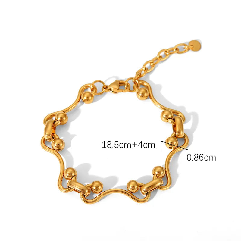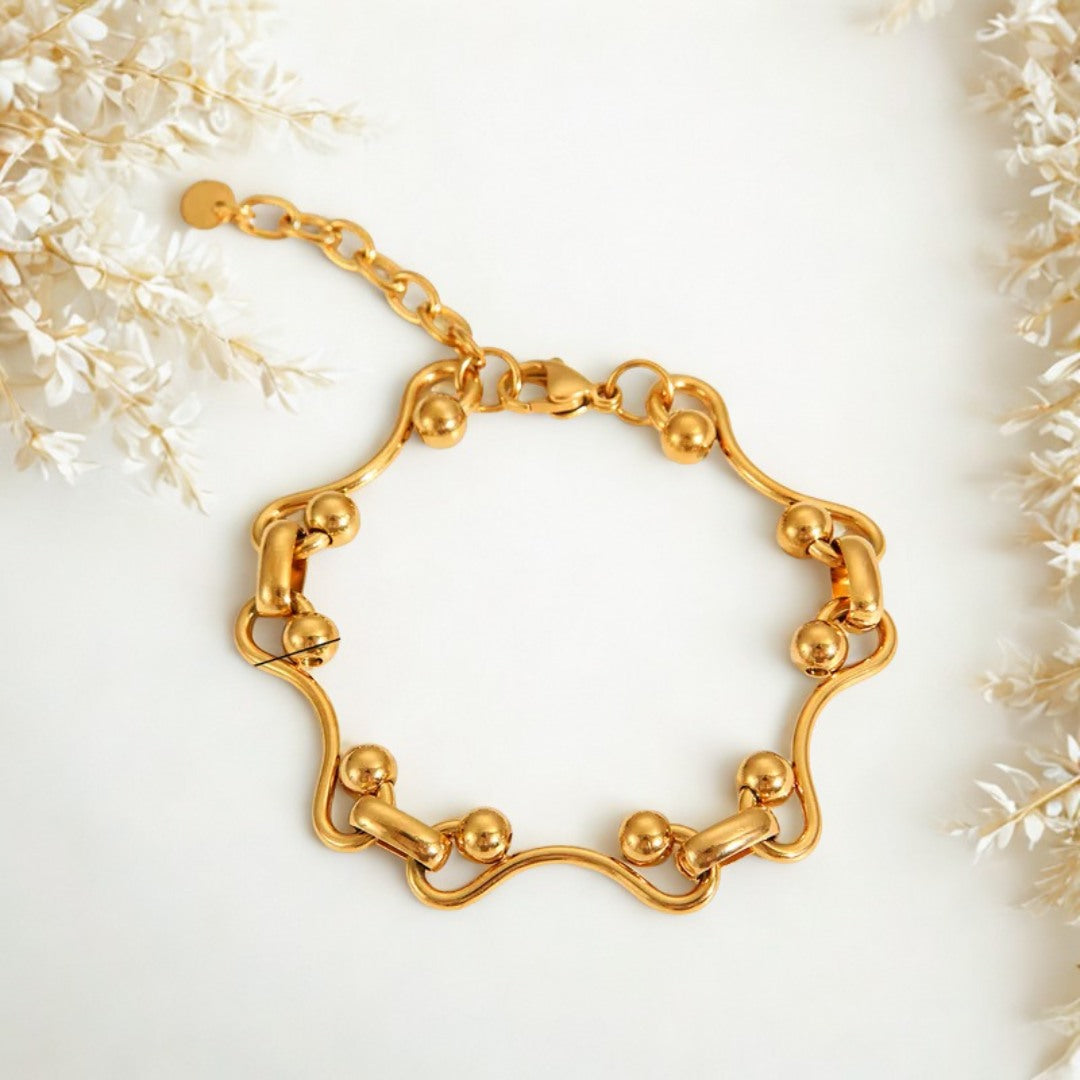 Le bracelet Célia séduit par sa structure fluide ponctuée de billes dorées. Moderne et raffiné, il habille le poignet avec caractère tout en conservant une allure délicate et féminine.