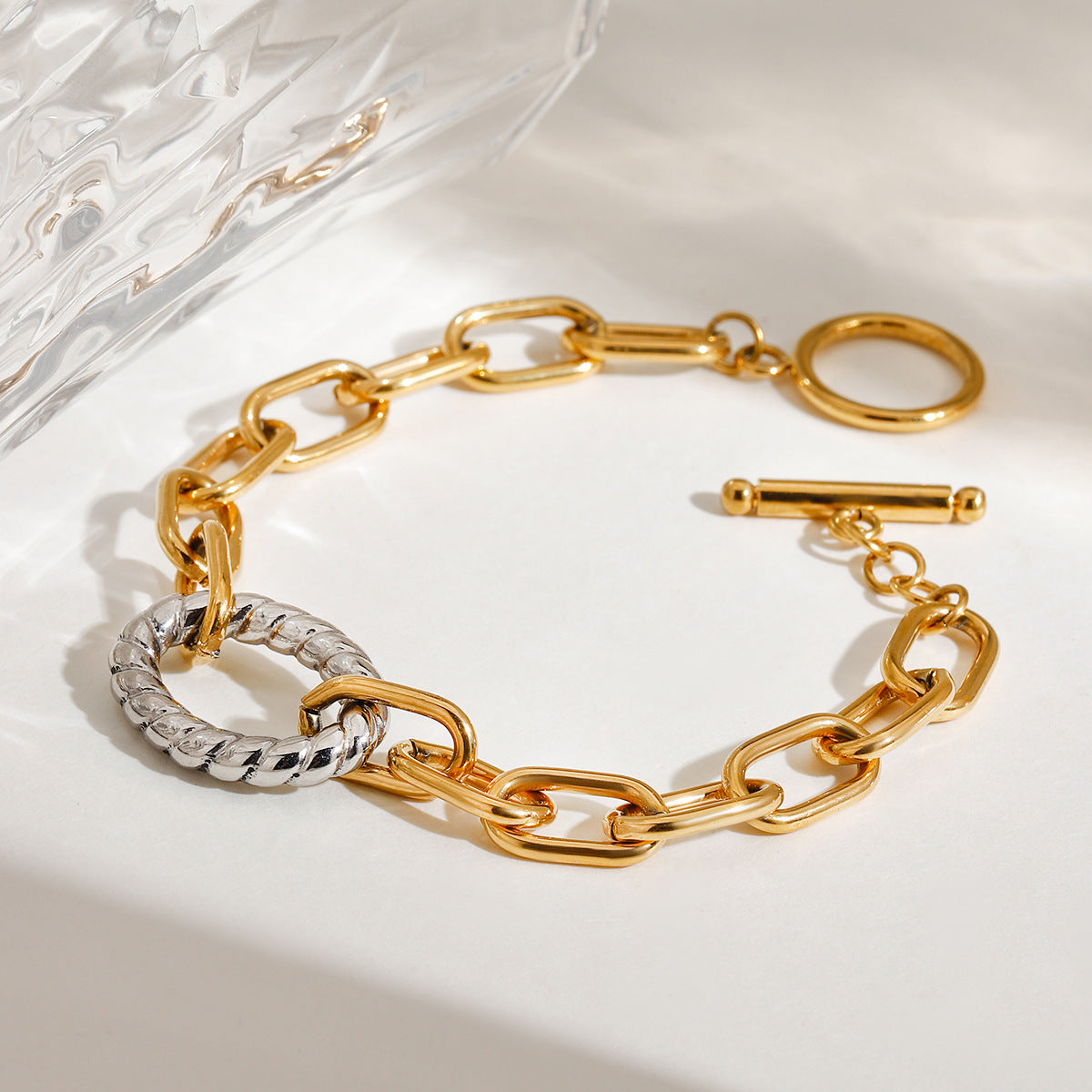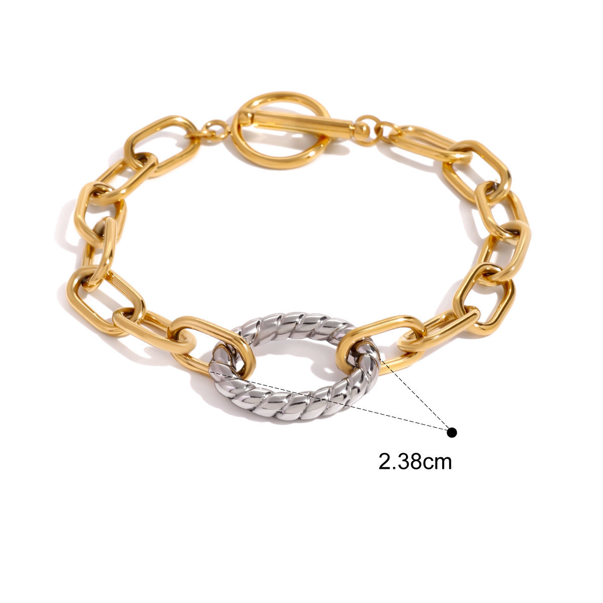 Ce bracelet se distingue par son grand anneau central argenté à texture tressée, sublimé par une chaîne dorée à larges maillons. Son design structuré apporte une touche contemporaine et affirmée à votre tenue.