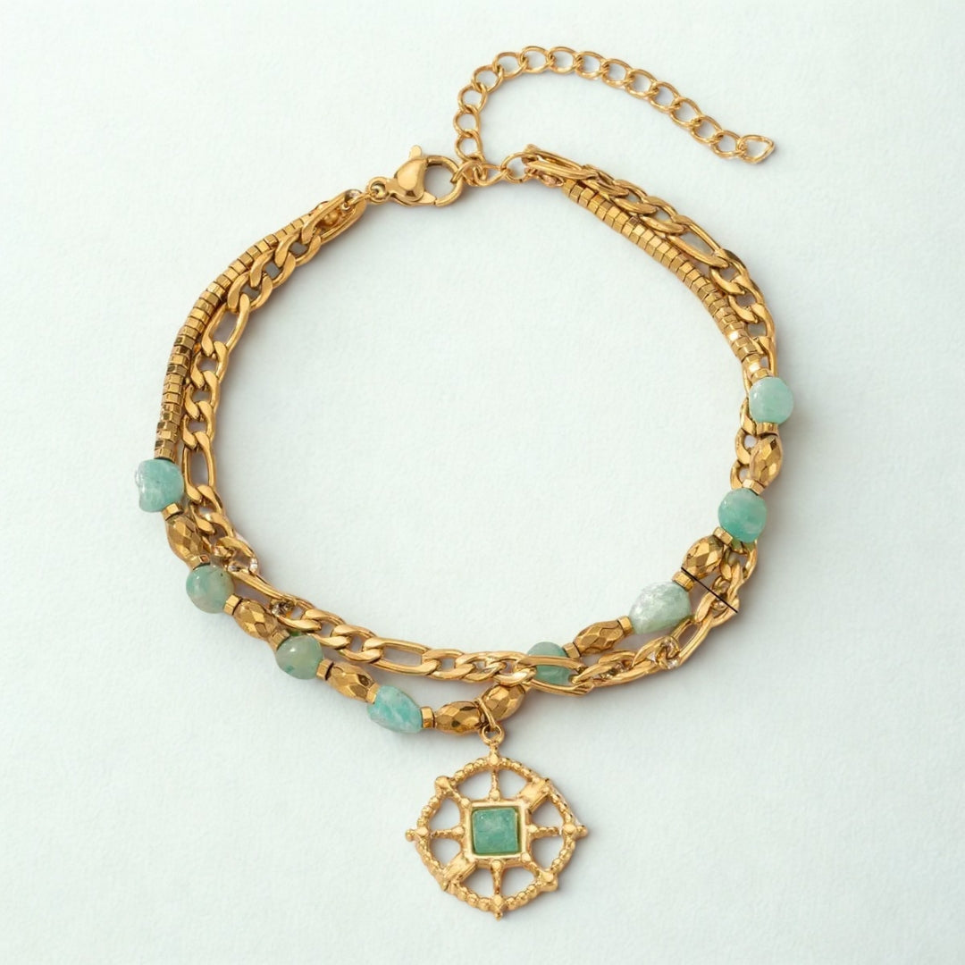 Le bracelet Auréa associe finesse et caractère grâce à ses chaînes dorées et ses perles facettées vert d’eau. Son pendentif ajouré à la structure géométrique encadre une pierre centrale pour une allure élégante et lumineuse.