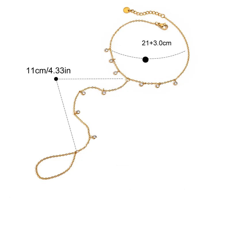 - Chaîne dorée fine avec pendentifs décoratifs le long de la cheville et anneau d’orteil intégré