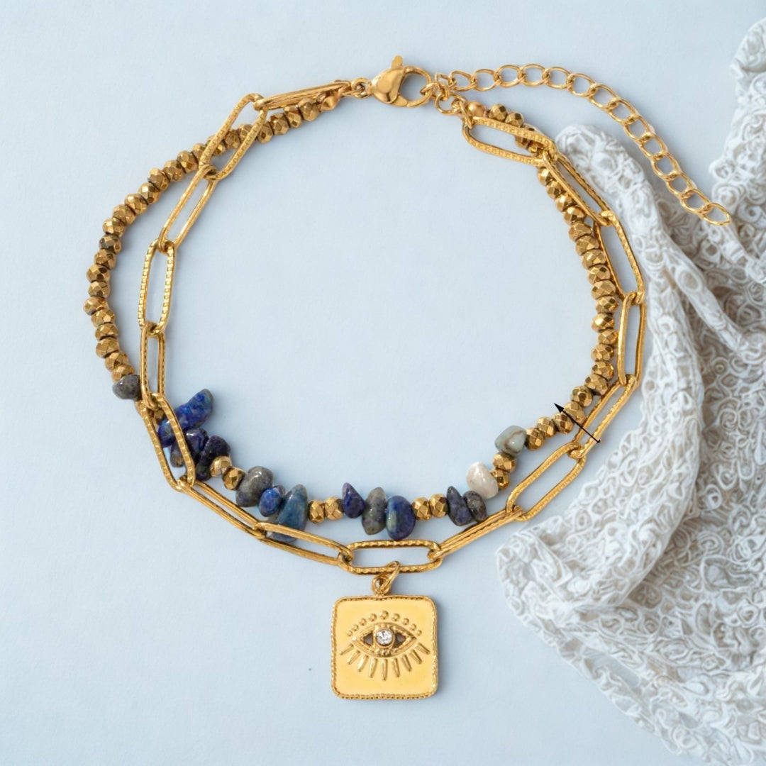 Le bracelet Lunea combine des perles dorées texturées, des pierres naturelles bleutées et une double chaîne élégante. Son pendentif carré doré orné d’un œil gravé et d’un strass central apporte une touche mystique et lumineuse à votre poignet.