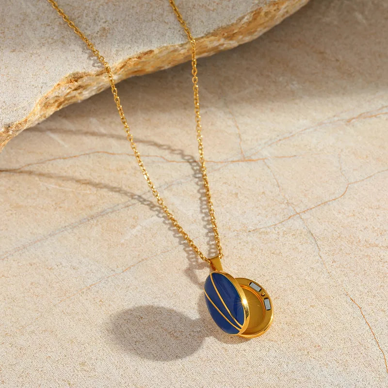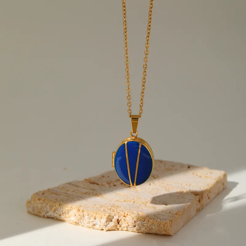 - Pendentif ovale bleu nuit à lignes dorées, avec compartiment intérieur