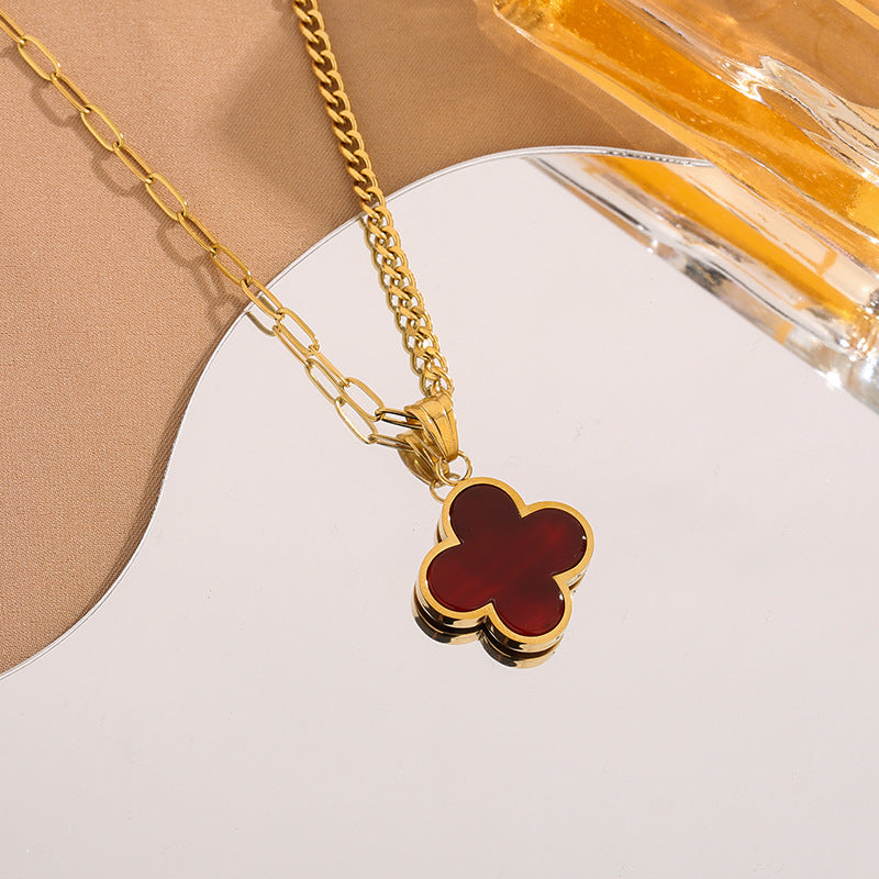 Ce bijou marie une chaîne dorée bicolore et un pendentif trèfle en rouge profond pour une allure sophistiquée et féminine. Une pièce à la fois intemporelle et audacieuse.