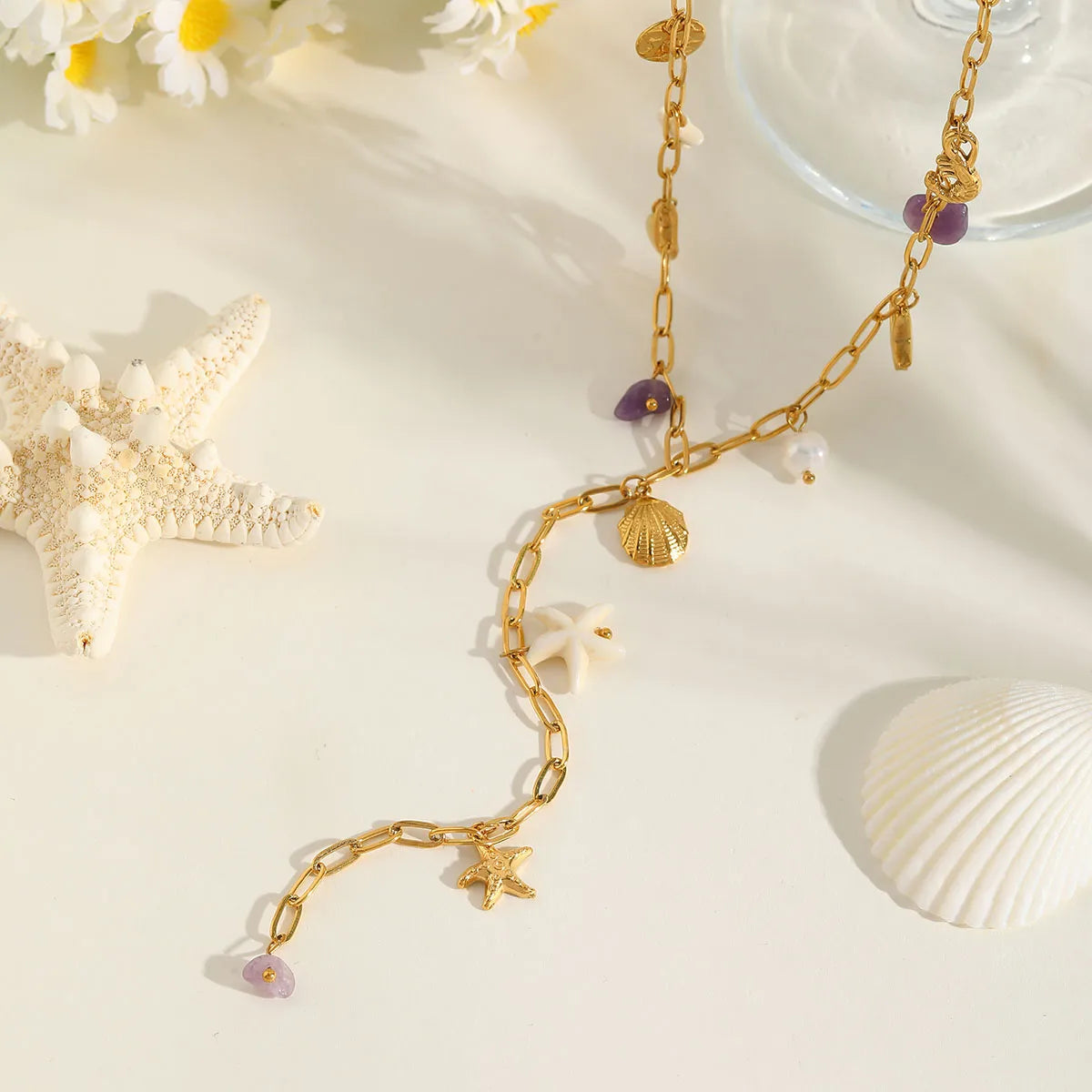 - Chaîne à maillons cubains avec pendentifs coquillage, étoile de mer, perles et pierres décoratives