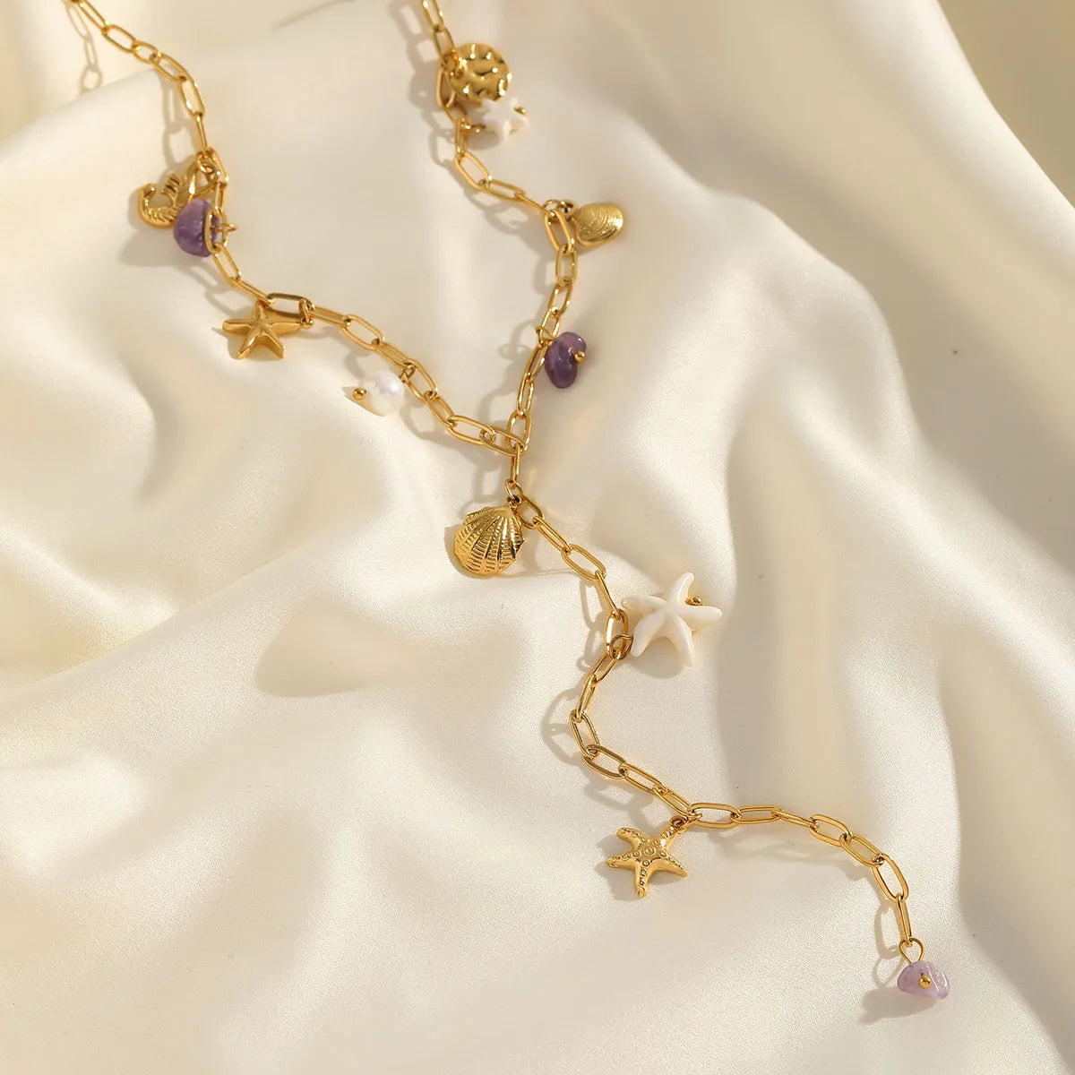 Inspiré des trésors de la mer, ce collier en Y mêle coquillages, étoiles de mer, perles et pierres violettes pour une allure estivale élégante. Un bijou original qui évoque les vacances et la douceur du sable chaud.