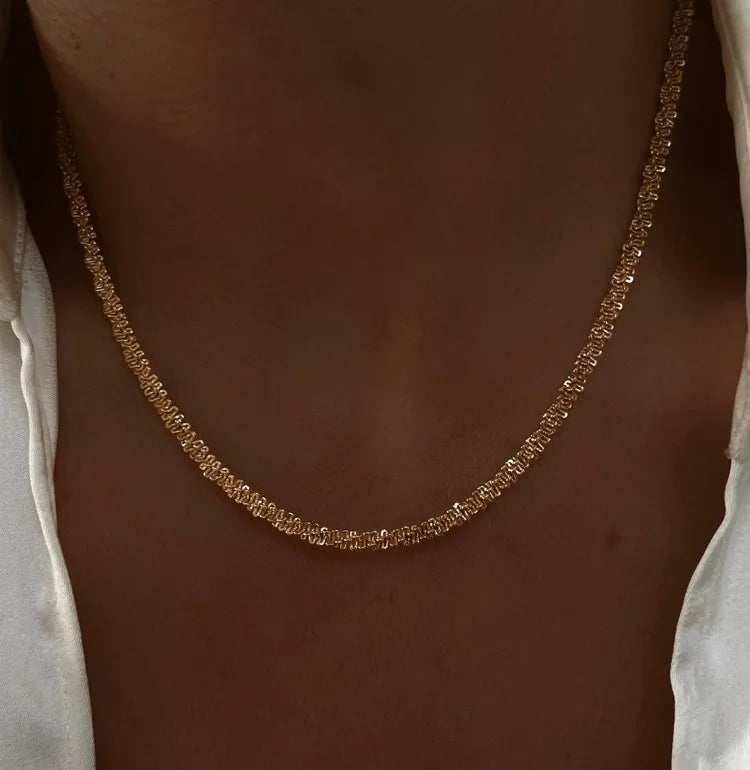 Ce bijou doré à la chaîne texturée et souple séduit par son design structuré et son fini brillant. Parfait pour rehausser une tenue avec caractère et élégance.