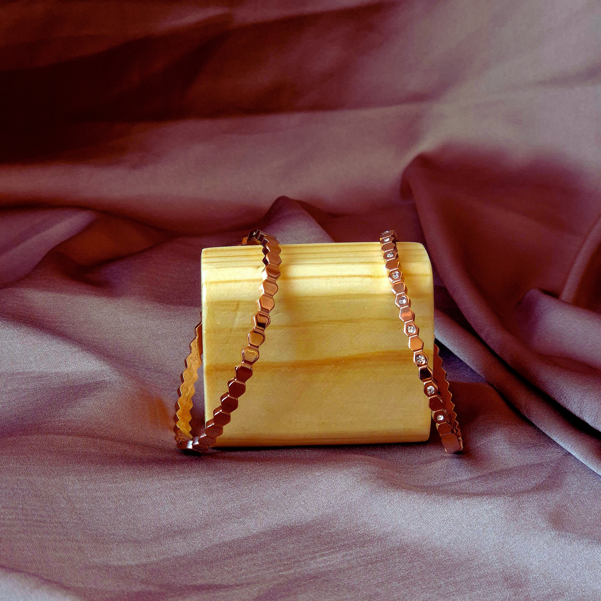 Ce duo élégant se distingue par ses maillons hexagonaux, à la fois modernes et raffinés. L’un présente une ligne lisse dorée, tandis que l’autre est sublimé par de petites zircones scintillantes pour un effet délicatement contrasté. Un bijou minimaliste et chic, disponible en deux coloris pour s’adapter à tous les styles.
