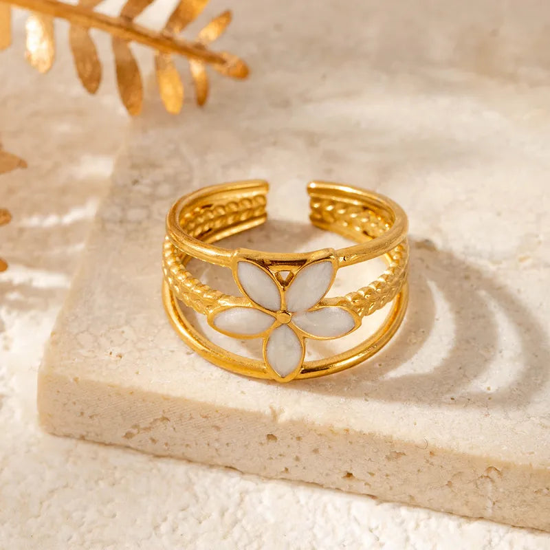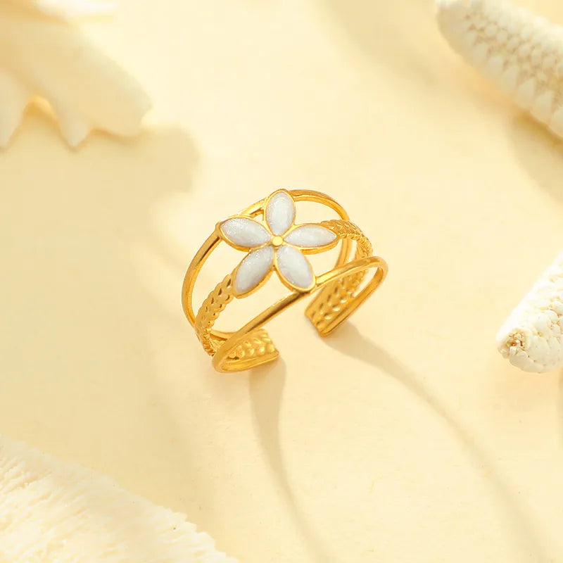 La bague Éclosia séduit par son motif floral aux pétales blancs nacrés, posé sur une monture dorée raffinée. Un bijou à la fois féminin et lumineux, parfait pour sublimer vos gestes au quotidien.