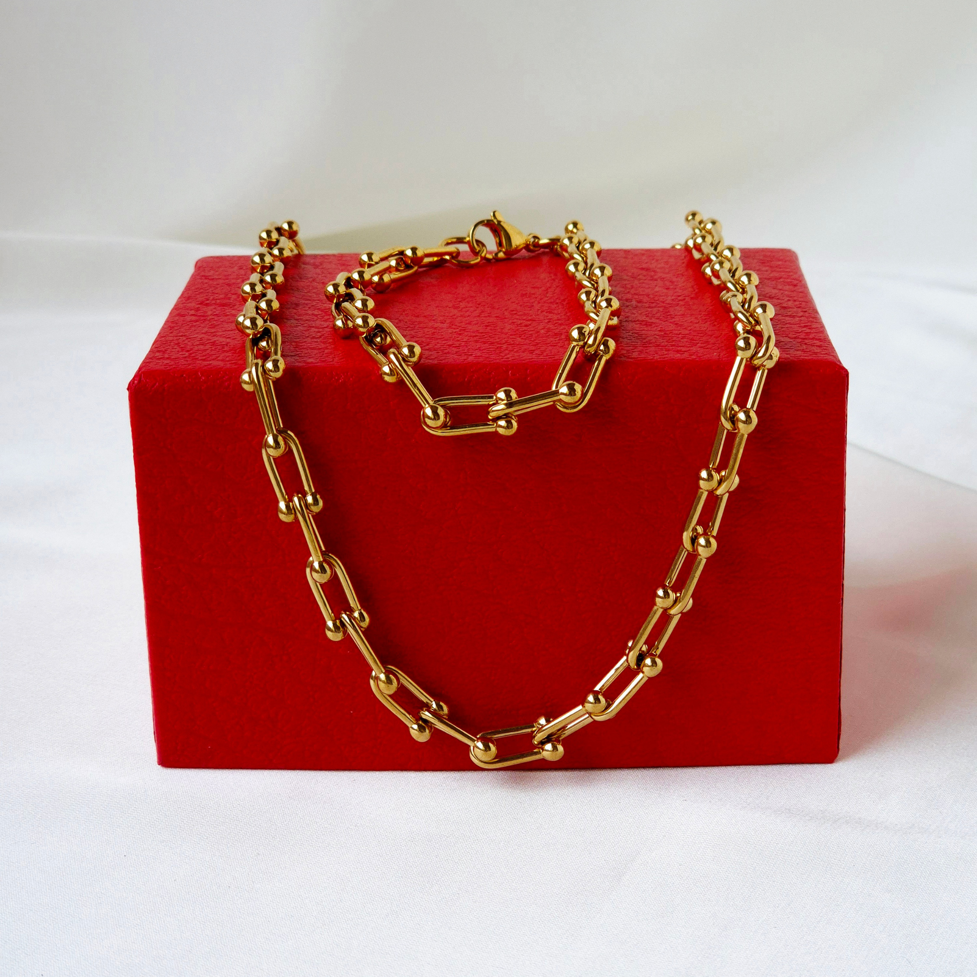 La parure Élise allie finesse et caractère à travers ses maillons aux formes arrondies ornés de petites perles dorées. Un design équilibré entre modernité et douceur, idéal pour illuminer vos tenues du quotidien comme vos soirées.