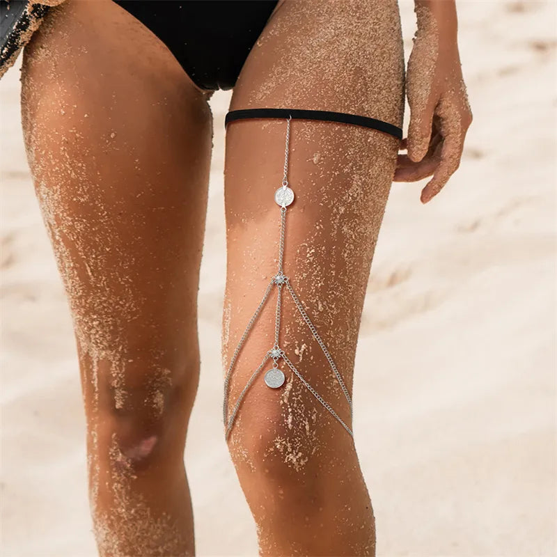 - Chaînes fines argentées en cascade pour une mise en valeur harmonieuse de la jambe