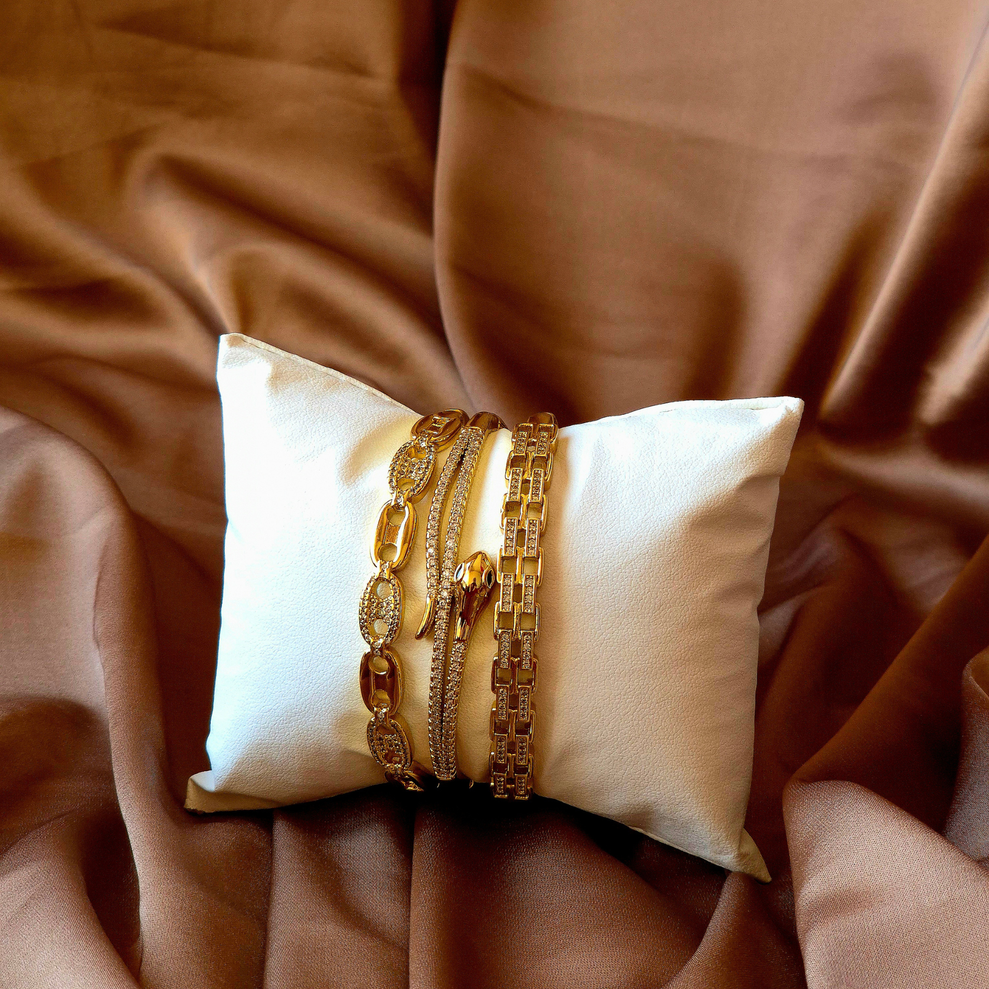Ce set raffiné se compose de trois bracelets plaqués or, ornés de pierres de zircone étincelantes. Le jeu de textures entre mailles délicates, anneaux sertis et motifs entrelacés crée un équilibre parfait entre modernité et féminité.
